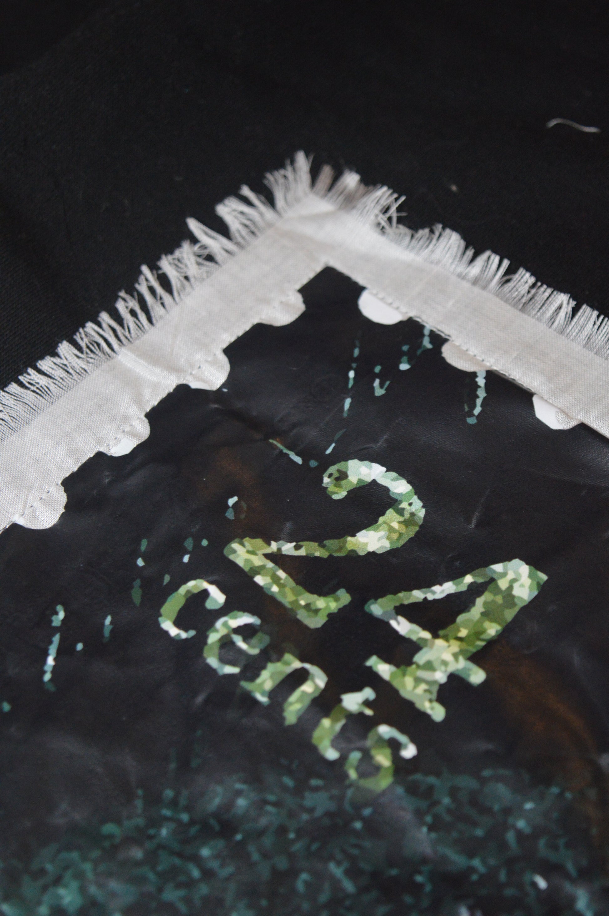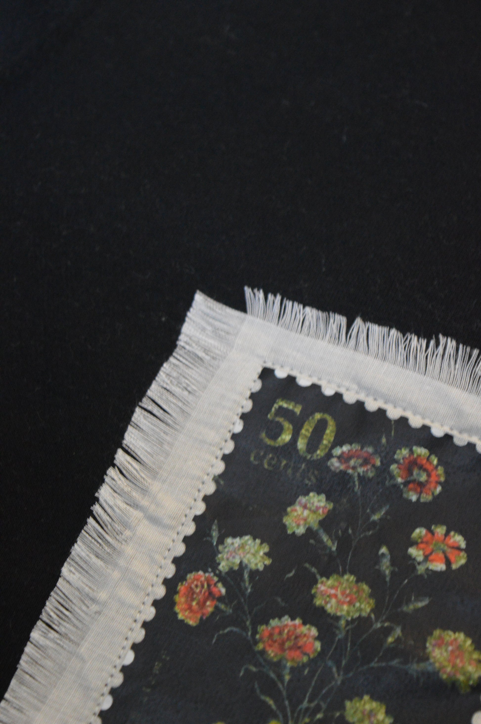 A black hoodie featuring a white embroidered STEEZI logo on the front, along with two small patches—a vintage stamp patch and a floral graphic. The back has a large postage-stamp style design with a 24 cents mark and an abstract artwork. Soft, comfortable, and designed with a mix of artistic and vintage elements.